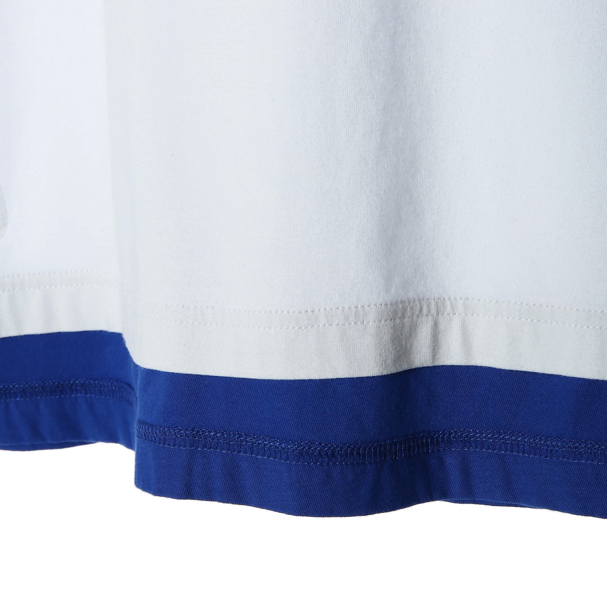 袖口と裾に配色の別布を配し、まるでTシャツを重ね着しているかのような奥行きを演出しました。フロントにはカレッジライクなブランドロゴを配し、クリーンなストリート感をプラス。
