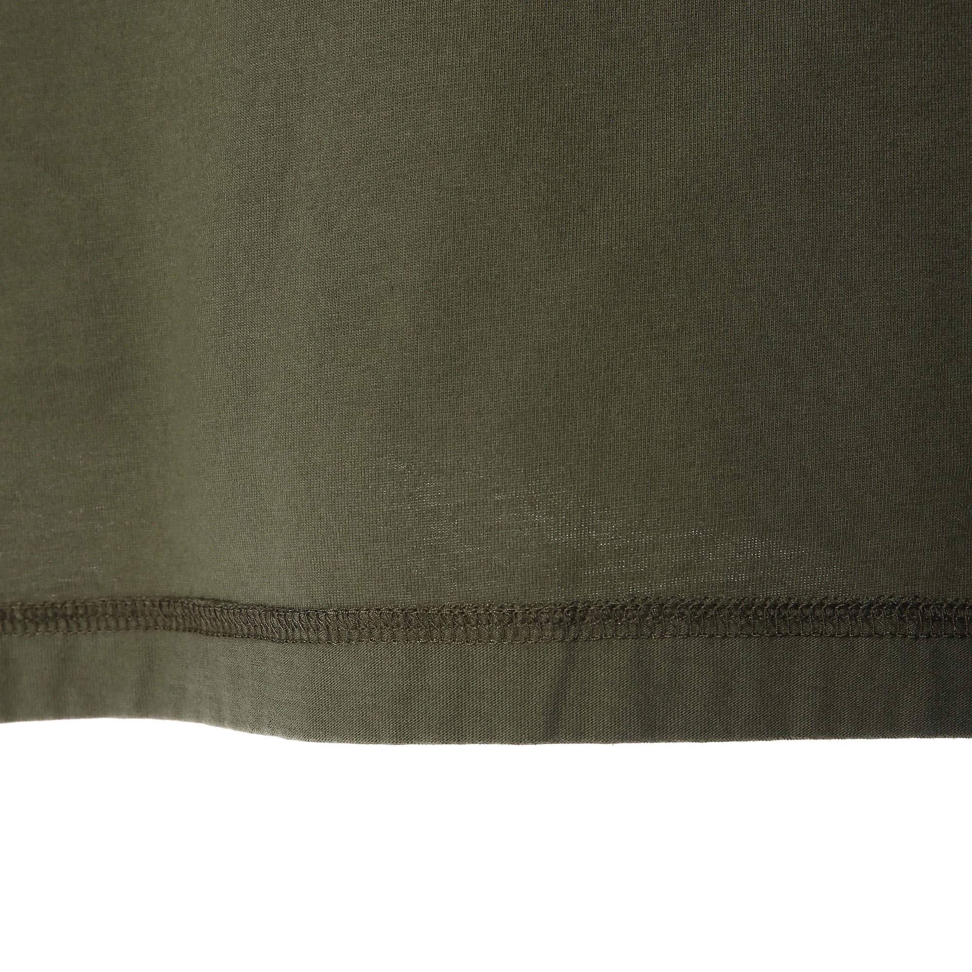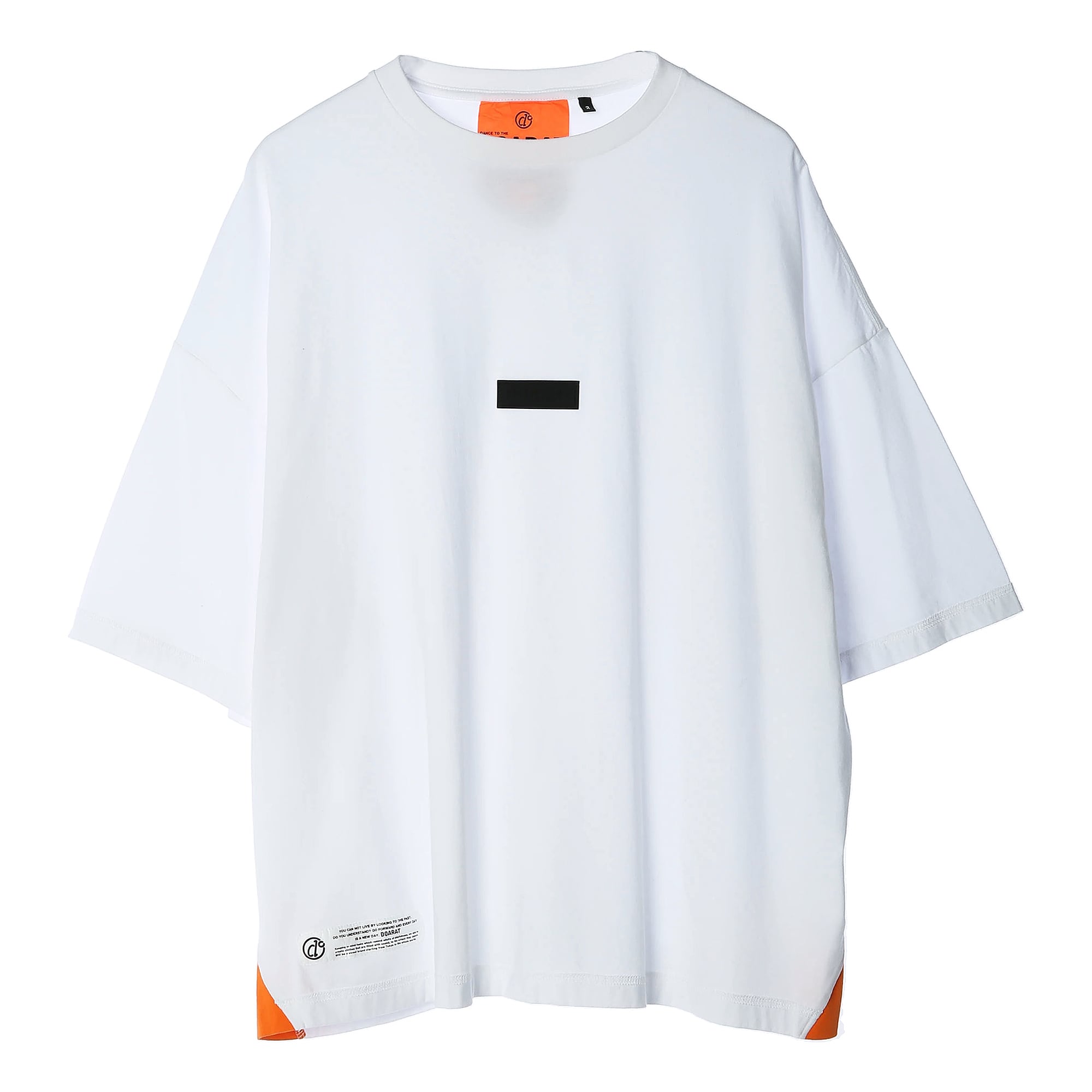 フロント中央には、あえて小ぶりに配置されたブラックのシリコン製ボックスロゴを採用。プリントにはない立体感とマットな質感が、都会的で洗練された印象を与えます。さらに、裾のサイドスリットにはブランドカラーであるオレンジを配し、動きに合わせてチラリと覗くアクセントに。