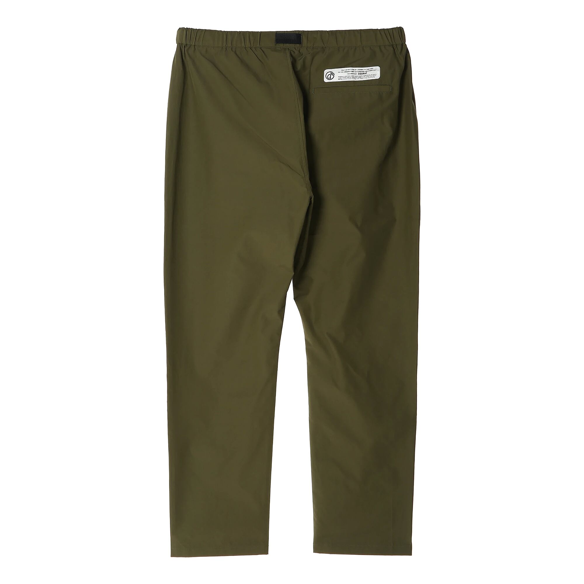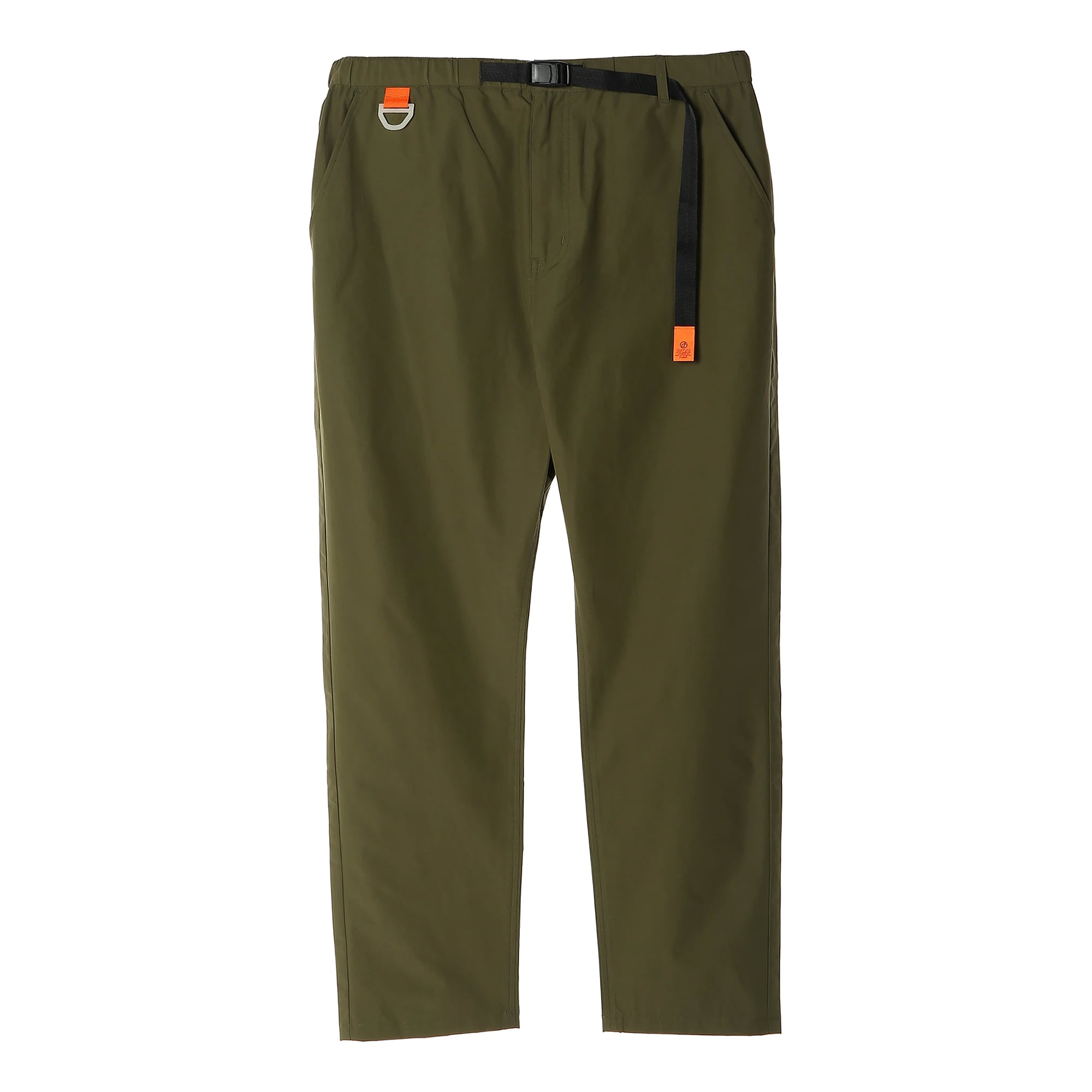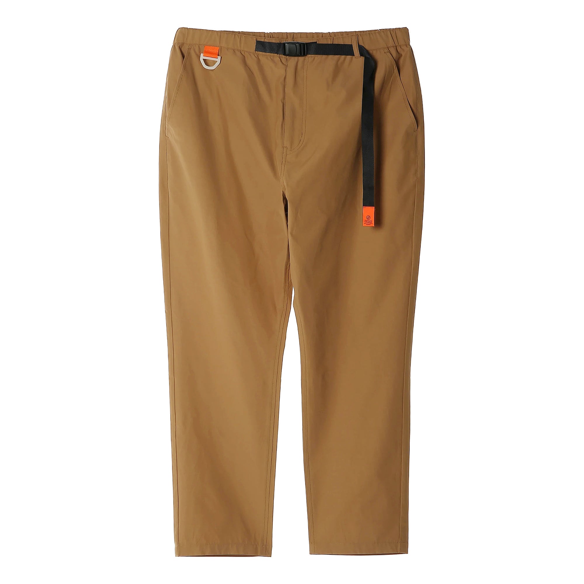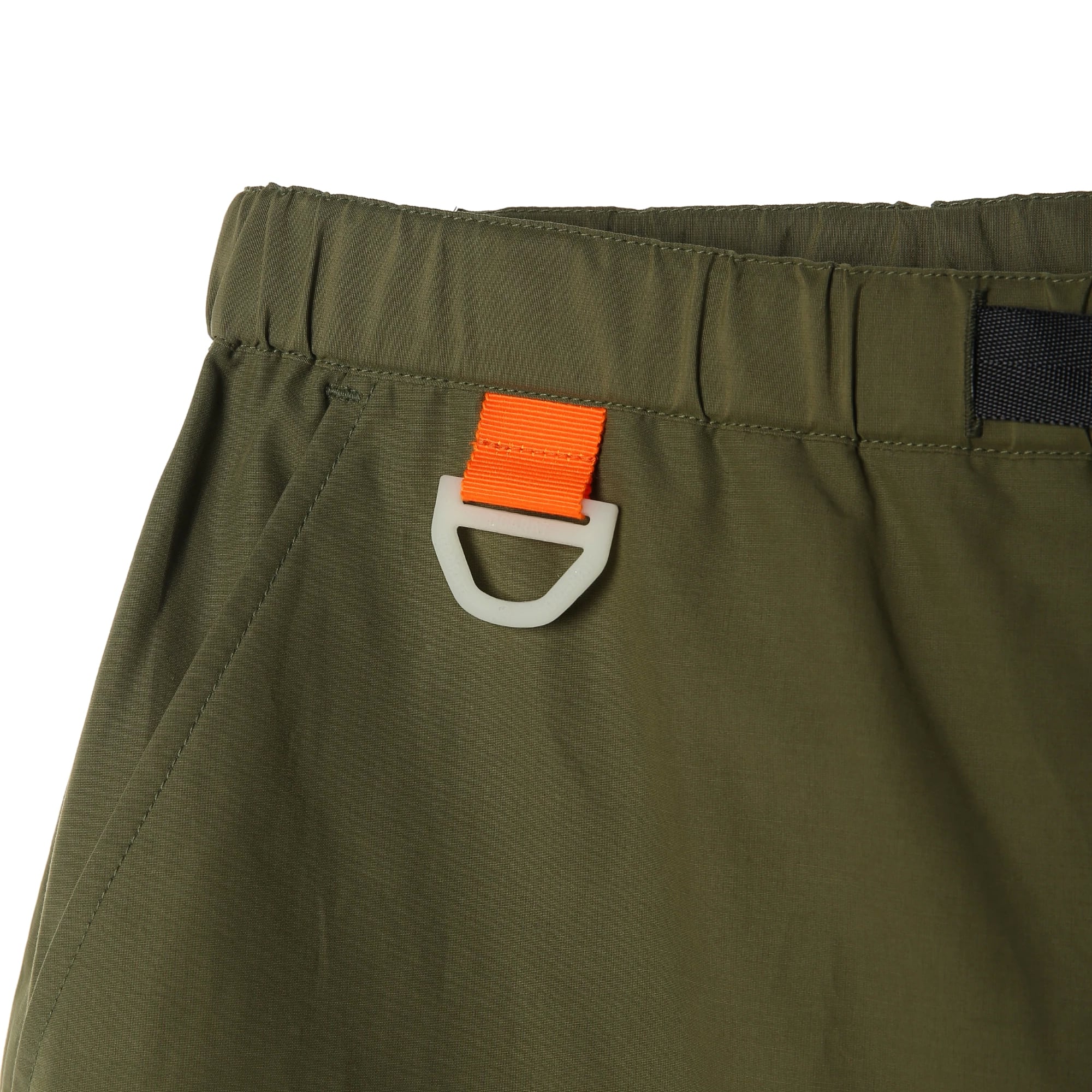 最大のポイントは、股下に配された**「ガゼットクロッチ」**。180度の開脚を可能にするこのディテールにより、自転車やボルダリング、キャンプなど、あらゆるアクティブな動きを妨げません。ウエストは片手で調節できるウェビングベルト仕様で、着脱もスムーズ。